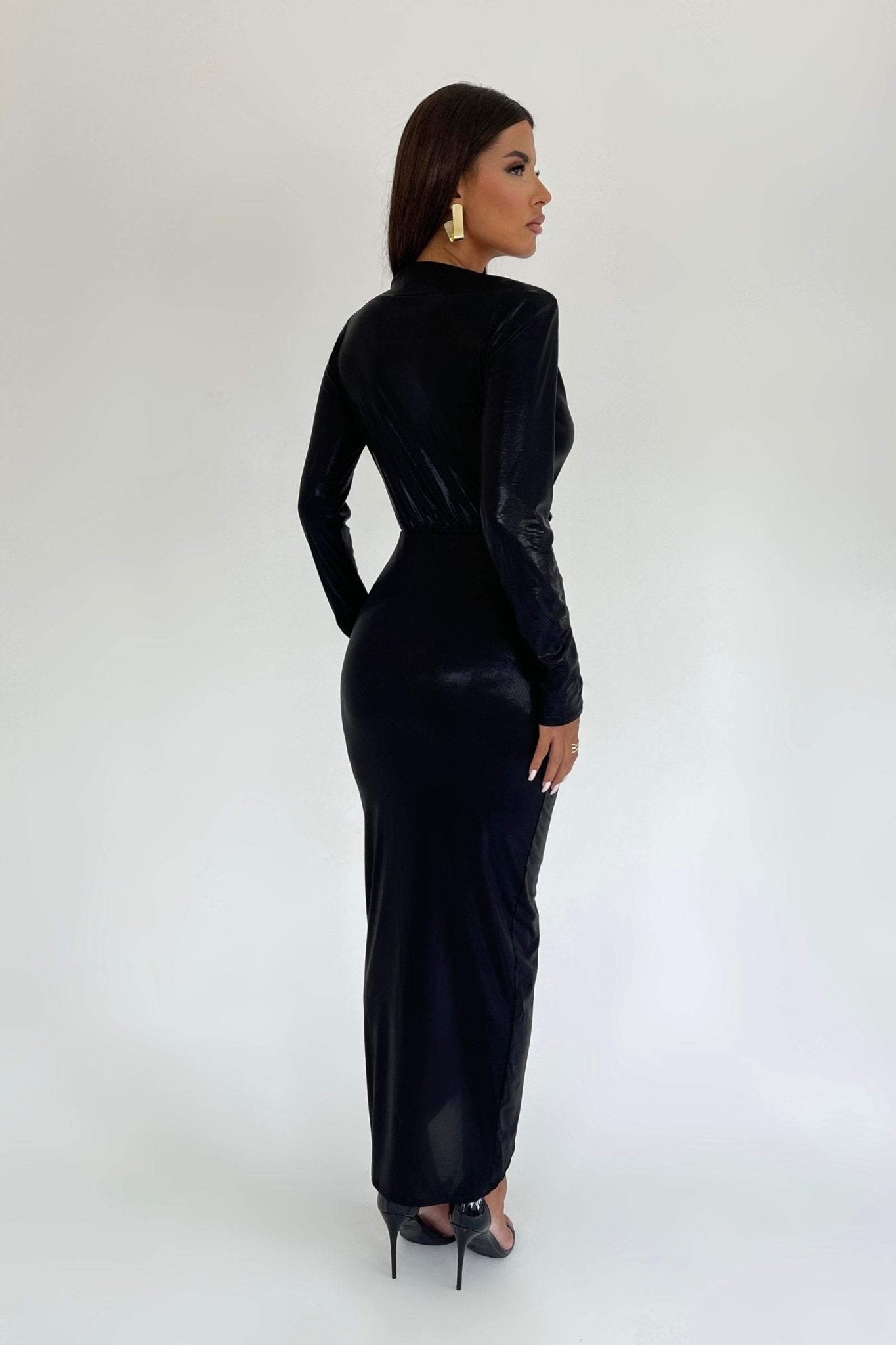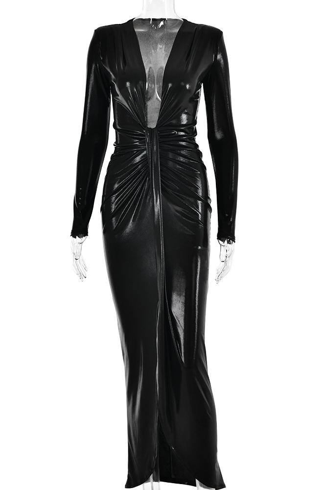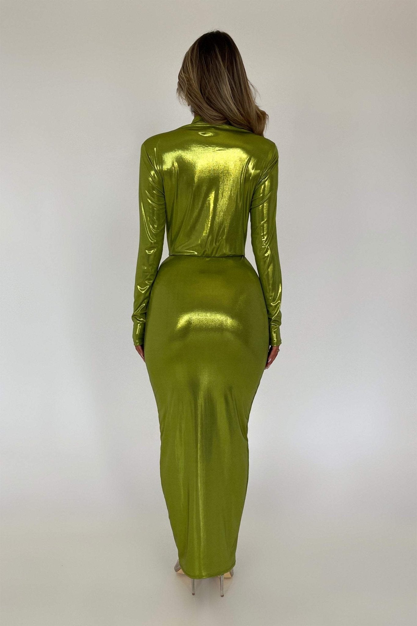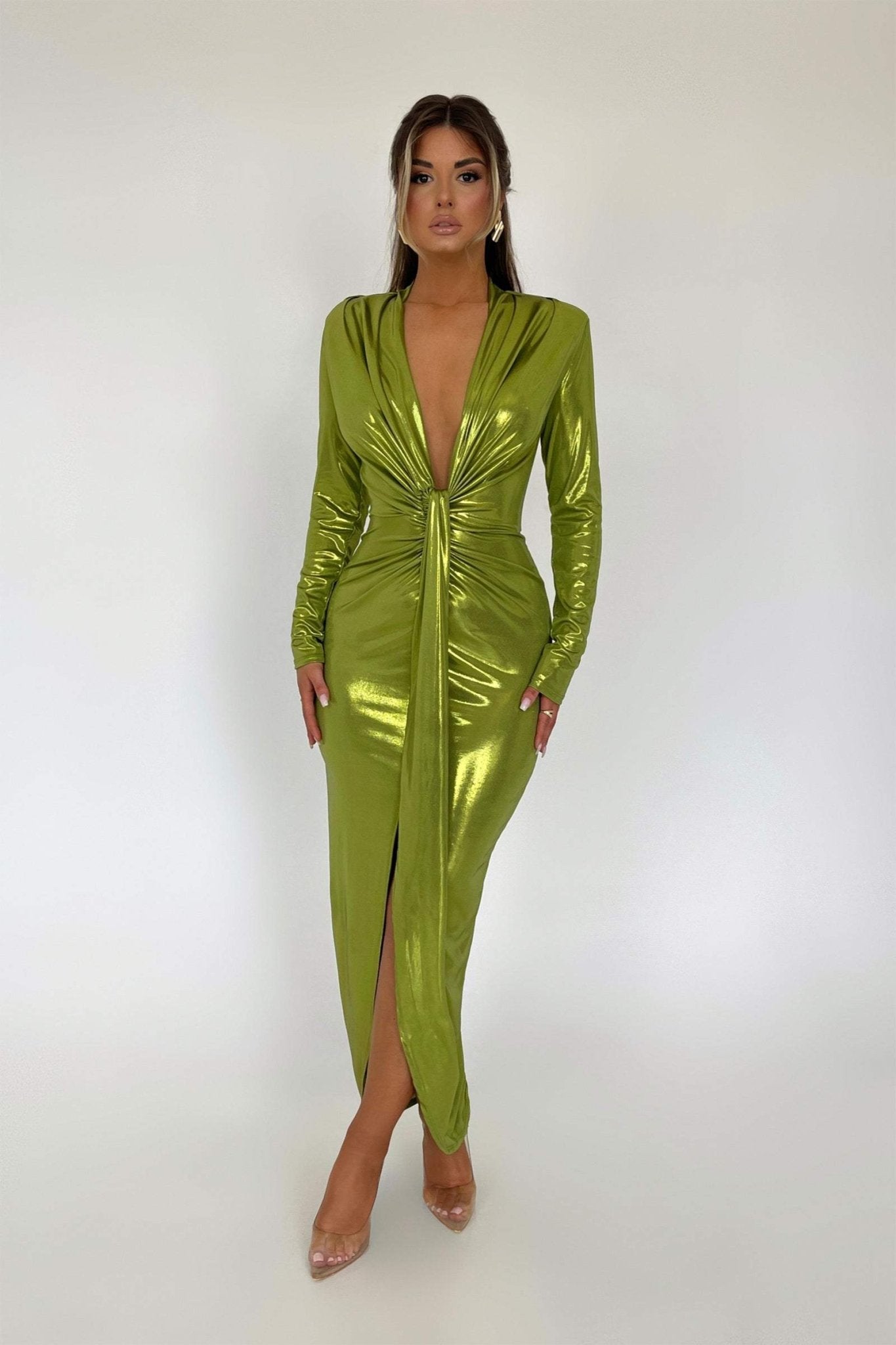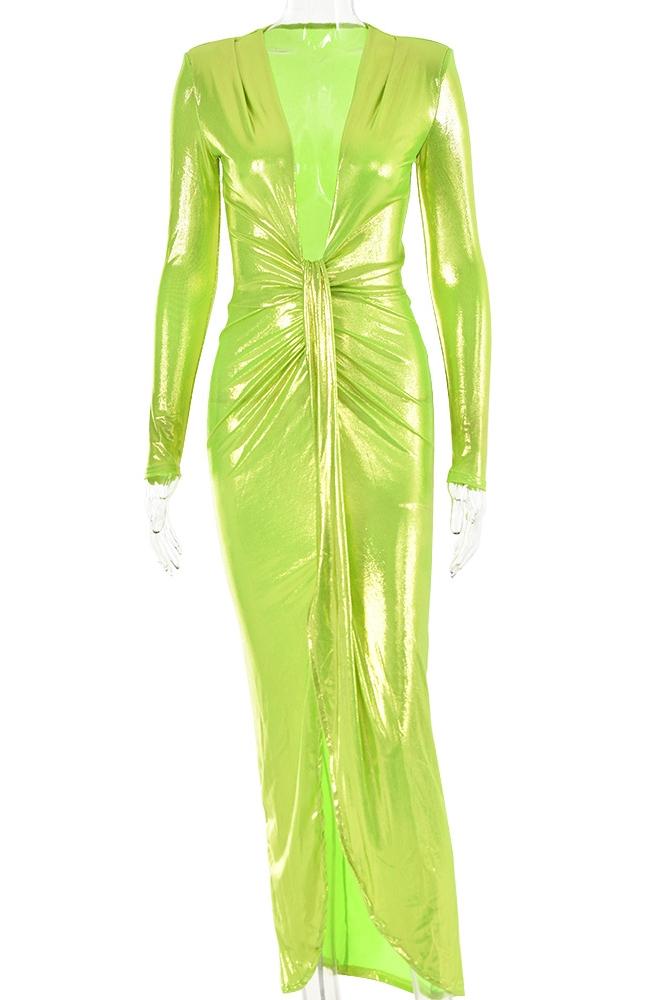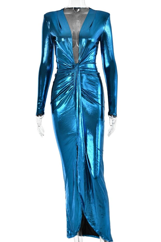 Bu son derece parlak metalik elbise, çarpıcı derin V yakalı, yüksek yırtmaçlı ve şık düğümlü bel hattına sahiptir. Metalik jarseden üretilen bu ürün, daha fazla konfor için yüksek esnekliğe sahip, vücuda oturan bir siluet sunuyor. Akşam etkinlikleri, kokteyl partileri veya özel günler için mükemmel olan bu elbise, göz alıcı bir görünüm için yüksek topuklu ayakkabılar ve cesur aksesuarlarla eşleştirilebilir.