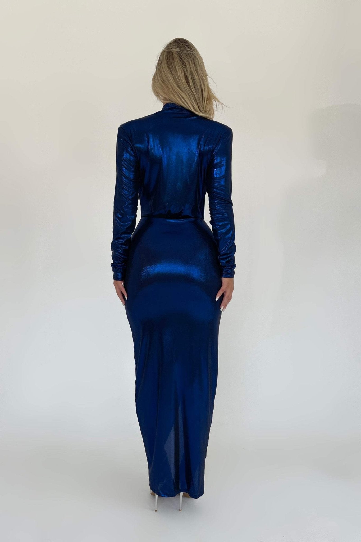 Altın (Stokta Mevcut), Mavi, Siyah ve Yeşil (tümü 2 haftalık teslimat süresine sahiptir) renklerinde mevcut olan bu elbise, göz kamaştırıcı metalik kaplamayı hoş bir kesim ve yüksek esneklikle birleştiriyor.