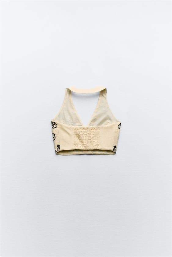Şık V yakalı ve zarif nakış detaylarına sahip bu boyundan bağlamalı kısa üstle gardırobunuzu yükseltin. Ayna efektli aplike cazibeli bir dokunuş katarak onu hem gündüz hem de gece etkinlikleri için mükemmel kılıyor.